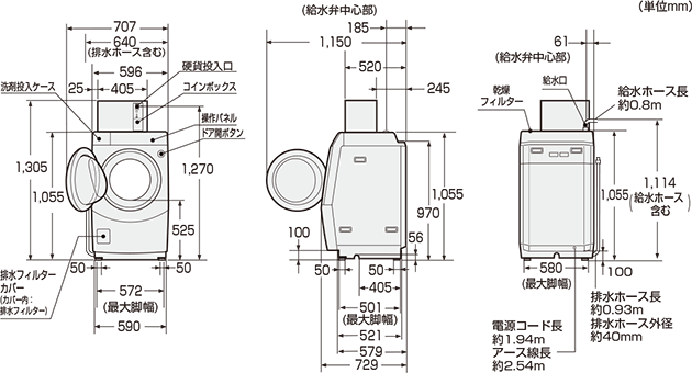 外形寸法 | 幅640×奥行729×高さ1,305mm(ボディ幅596mm) |