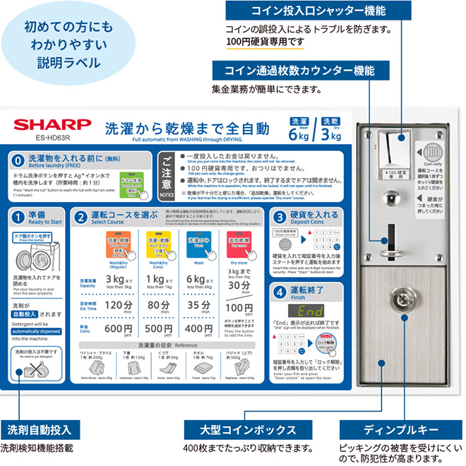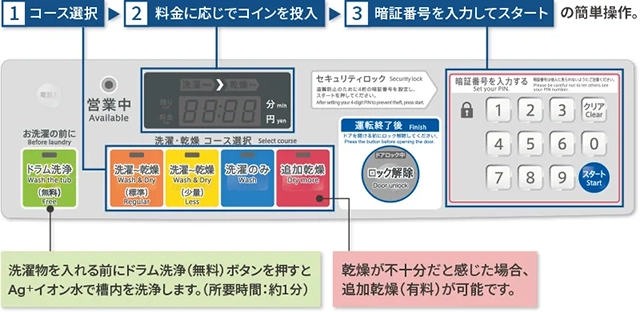 運転コース | 洗濯~乾燥 標準コース(3.0kg):120分(洗濯40分 乾燥80分)、600円 洗濯~乾燥 少量コース(1.0kg):80分(洗濯30分 乾燥50分)、500円 洗濯のみコース(6.0kg):35分、400円 追加乾燥コース(3.0kg):30~120分(タイマー設定)/100円/30分 ドラム洗浄コース:約1分、無料 |