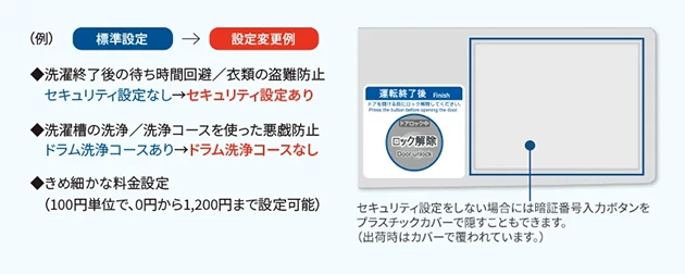 病院・ビジネスホテル・寮など、多彩なシーンに合わせて、運転時間や金額設定を変更することができます。また、セキュリティ設定や、洗剤自動投入などの変更も可能です。